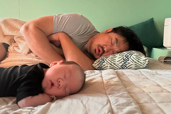 사진 속 강재준은 아들 현조를 품에 안고 깊이 잠든 모습으로, 밤새 이어진 육아의 피로를 엿볼 수 있었다.