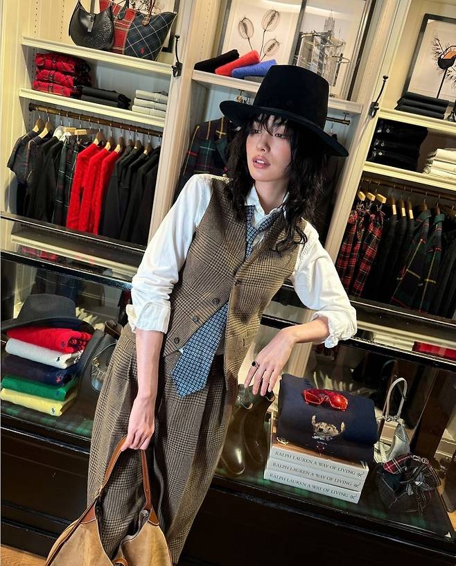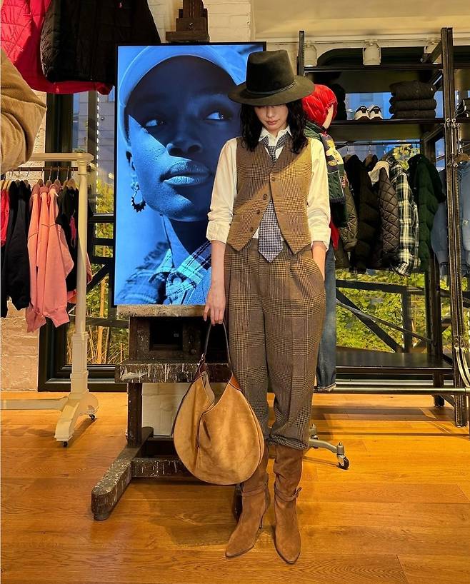 나나는 깊이 있는 갈색 체크 패턴의 베스트와 팬츠를 매치해 고전적인 분위기를 연출했습니다.