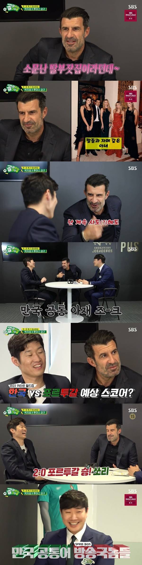 피구는 세 딸을 “골든볼 3개, 너무 자랑스럽다”고 언급하며 박지성이 아들 하나, 딸 하나라는 말에 “나는 계속 시도해도 딸이라 멈췄다”고 만국 공용 아재 개그로 웃음을 줬다. 이어 피구는 2022년 경기 결과 예측에 대해 2:0 포르투갈의 승리를 점치며 “우리가 이길 때”라고 말했다. 박지성은 1:1을 예상했다.