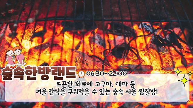 특히, 숲속한방랜드의 장점은 숯가마 앞에 놓인 화로인데요. 요즘처럼 찬 바람이 부는 계절에 뜨끈한 화로에 앉아 가래떡이나 고구마와 같은 겨울 간식을 즐길 수 있죠. 입천장이 까질 정도로 뜨거운 겨울 간식과 숲속에서의 힐링은, 그곳이 바로 천국일 것 같네요.