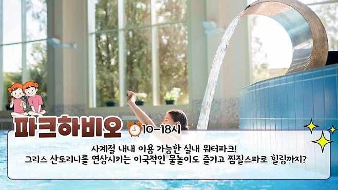 사계절 이용 가능한 실내형 워터파크, 파크하비오 워터킹덤&찜질 스파입니다. 이곳은 지중해 산토리니를 연상시키는 이국적인 분위기 속에서 물놀이와 휴식을 즐길 수 있습니다.