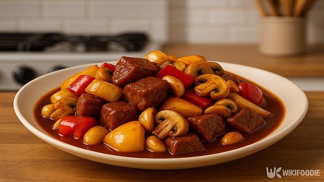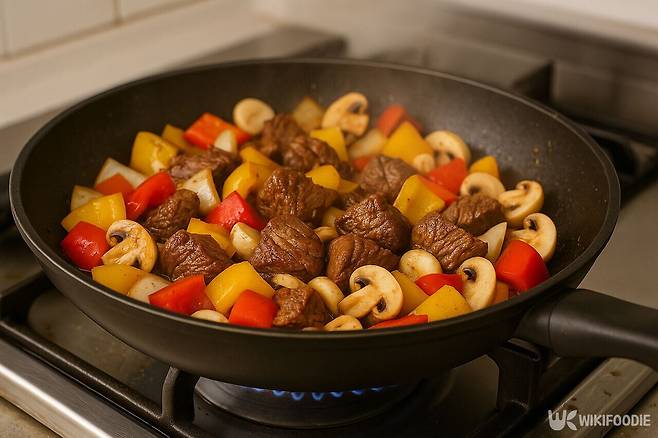 소고기와 채소를 함께 넣은 뒤엔 센 불에서 빠르게 볶는다. 소스를 붓고 중불로 졸이듯 볶다가, 국물이 자작하게 남을 때 불을 끈다. 이때 간을 본 후 돈까스소스나 케찹을 1T 정도 추가하면 입맛에 맞게 조절할 수 있다.