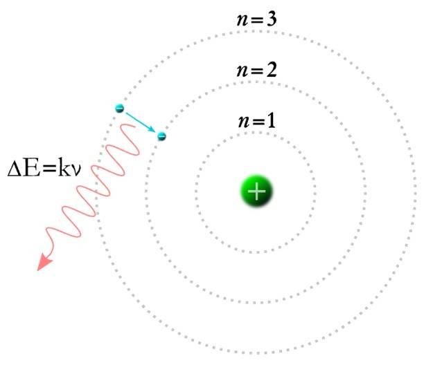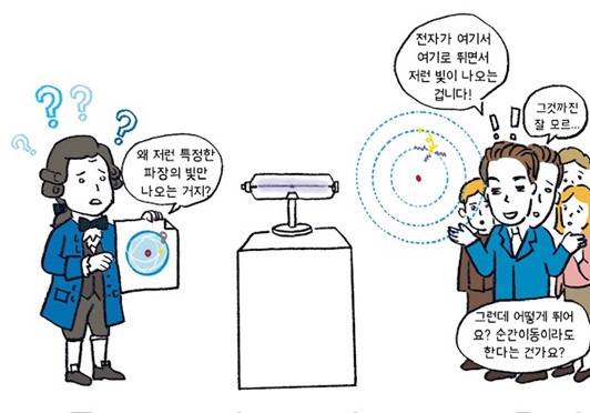 하지만 불연속적 궤도와 양자 도약을 제외하면 여전히 고전역학이 성립한다. 양자 가설과 고전역학의 불완전한 ‘짬뽕’이라고 할까. 중요한 것은 이 불완전한 이론이 당시까지 고전 이론이 설명하지 못한 몇몇 현상을 성공적으로 설명했다는 것이다. 대표적으로 네온 사인과 같이 원자에서 나오는 빛이 있다. 이 빛은 자세히 보면 여러 색깔의 선으로 이뤄져 있어 원자의 선 스펙트럼이라고 한다. 이것은 전자가 한 궤도에서 다른 궤도로 도약할 때 그 차이만큼의 에너지가 빛으로 나온 것이다 (그림 1).