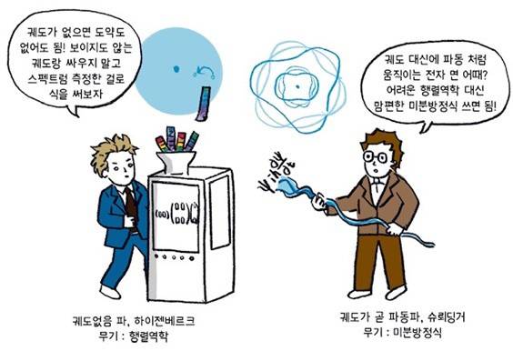 여기서 더 나아가, 슈뢰딩거는 파동의 연속적 운동으로 전자의 불연속적 궤도와 양자 도약을 대체하려 했다. 이제 전자는 하나의 점처럼 움직이지 않고 마치 겹쳐서 퍼져나가는 물결처럼 움직인다. 궤도 개념을 아예 포기한 하이젠베르크와 달리 슈뢰딩거는 그것을 대신할 파동 개념을 찾은 것이다. 물론 전자는 더 이상 점처럼 움직이지 않지만, 그것이 파동처럼 운동한다는 것은 많은 물리학자에게 위안이 됐다. 아예 없는 것보다 무엇이라도 운동하는 것이 있는 것이 나았다. 이제 물리학자들은 슈뢰딩거 쪽으로 많이 기울었고 하이젠베르크의 행렬역학은 위기에 처했다 (그림 5).