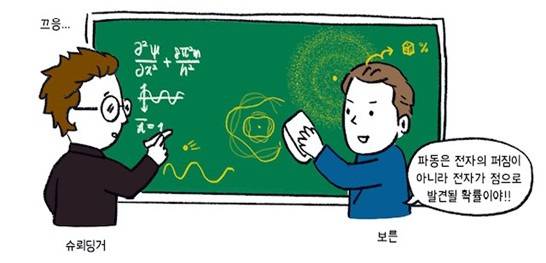 여기서 행렬역학을 발전시킨 보른은 놀라운 개념을 떠올린다. 퍼져나가는 파동 자체가 전자는 아니다. 이것은 슈뢰딩거가 잘못 생각한 것이다. 오히려 퍼져나가는 것은 전자를 발견할 확률이다. 곧 슈뢰딩거의 파동은 전자가 어느 위치에서 발견될 확률을 나타낸다. 슈뢰딩거 방정식은 전자가 직접 움직이는 모습이 아닌, 시간에 따라 전자가 어느 위치에서 점으로 발견될 확률을 알려준다 (그림 6).