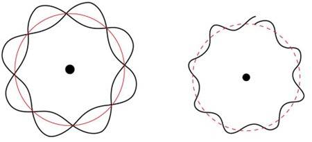 하지만 몇 달 뒤 같은 문제를 전혀 다른 방향에서 접근한 물리학자가 있었다. 빈 출신의 물리학자 슈뢰딩거였다. 1923년 드브로이는 전자 궤도를 행성 궤도가 아닌, 둥그렇게 이어진 기타줄처럼 생각했다. 기타줄을 튕기면 줄의 길이에 딱 맞는 도, 레, 미 소리만 깨끗하게 난다. 마찬가지로 전자 궤도도 기타줄처럼 연결하면 그 길이에 딱 맞는 1배, 2배, 3배의 불연속적 궤도가 만들어진다. 기타줄은 흔들리며 소리를 낸다. 그렇다면 전자라는 기타줄은 어떻게 출렁이며 빛을 낼까. 슈뢰딩거는 전자라는 파동이 춤추고 연주되는 악보를 찾아냈다. 바로 그 유명한 슈뢰딩거의 파동방정식이었다 (그림 4).