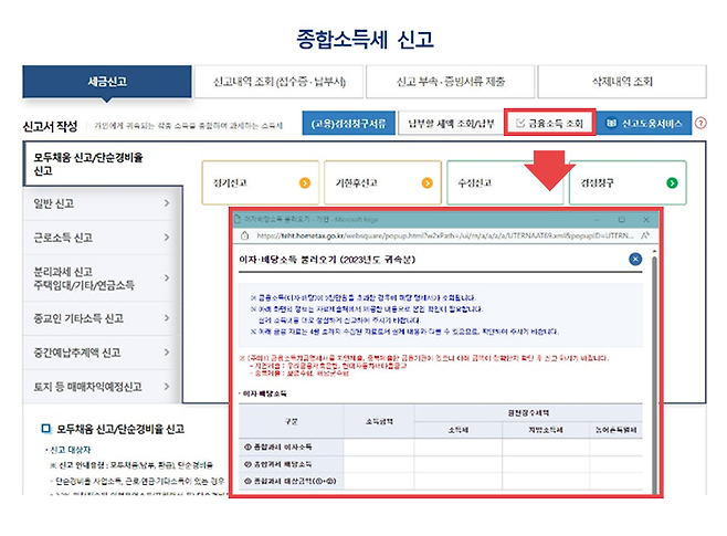 혹시 계좌가 많은데 정리가 안되어서 자신의 금융소득을 정확하게 모르는 경우에는 국세청의 홈택스에서 들어가셔서 종합소득세 신고항목의 ‘금융소득조회’를 통해 확인이 가능합니다.