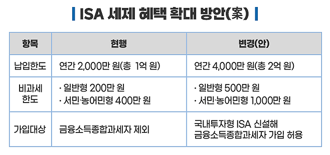 다행히 2024년 1월 ISA 세제 지원을 강화하겠다는 정부의 ISA 세제 혜택 확대 방안을 보면 ‘국내투자형 ISA’를 신설해 금융소득종합과세 대상자도 가입할 수 있게 할 예정이라고 합니다. (단 비과세 등의 혜택은 적용하지 않고, 분리과세 혜택만 적용)