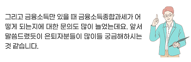 팬데믹이 수그러들 무렵에 연 5~6% 이상의 고금리 상품들이 금융회사마다 경쟁적으로 출시되었고, 이들 상품의 만기가 2023년 하반기에 많이 몰리는 바람에 금융소득이 2,000만 원을 넘는 사람들이 늘게 되었습니다.