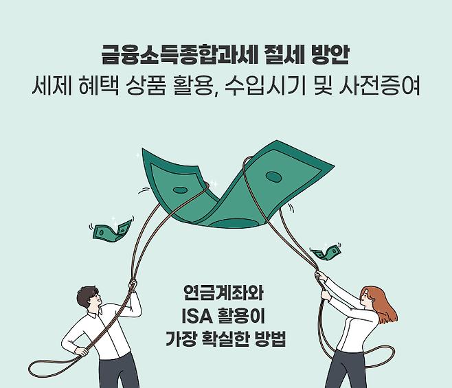 일반적인 계좌에서 발생하는 모든 금융수익은 금융소득종합과세 합산에서 벗어날 수 없지만, 아예 다른 세제를 적용받을 수 있는 절세상품을 활용하면 가장 확실한 방법이 됩니다.