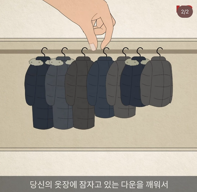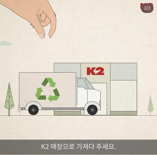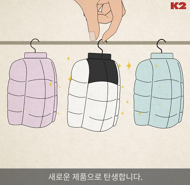 K2가 최근 인스타그램 동영상 릴스로 제작해 게재한 'K2 리사이클 유어 다운 캠페인' 광고에는 집게를 한 여성 손 모양이 다운 패딩을 집는 이미지가 무려 4곳에서 등장한다.
