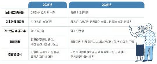 노인 연령 상향 논의 이면에는 복지 재정 급증에 대한 우려가 깔려 있다. 한국보건사회연구원 분석에 따르면 노인 기준을 65세에서 70세로 올리면 기초연금 지출만 연평균 6.5조원에서 6.8조원가량 절감할 수 있다. 2025년 노인 복지 예산은 27조원 규모로, 매년 증가 추세다. 2026년에는 29조 3161억원으로 늘어날 전망이다.