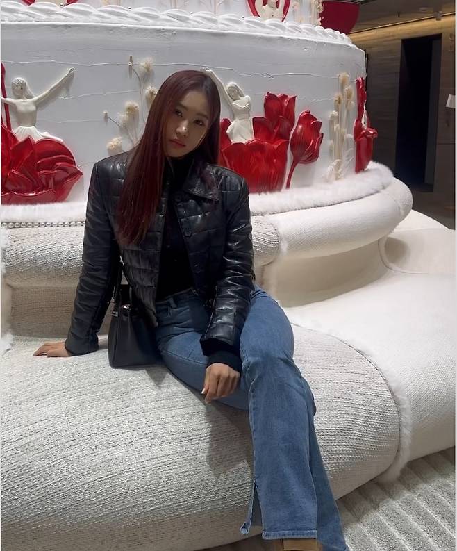 유현주는 블랙 레더 퀼팅 재킷과 플레어 핏 청바지를 매치해 심플하면서도 세련된 겨울 스타일을 선보였습니다.
