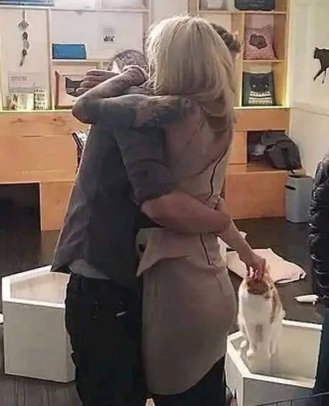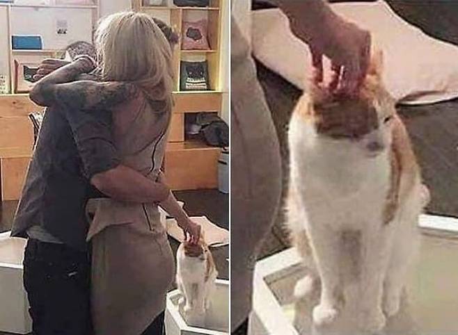 남자는 여자친구랑 포옹하면서 뒤에 있는 고양이에게 손을 뻗어 머리를 쓰담쓰담해주고 있었던 것이었는데요.