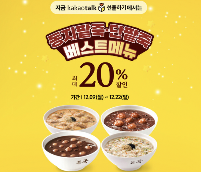 한식 브랜드 본죽은 동지를 맞아 카카오톡 선물하기와 자사 앱 본오더를 통해 동지 프로모션을 진행 중입니다. 단팥죽과 동지팥죽을 최대 20% 할인된 가격으로 구매할 수 있으며, 본오더 앱에서는 주문 시 100% 확률로 새해 행운 쿠폰을 제공해 다양한 할인 혜택과 이벤트를 즐길 수 있습니다.