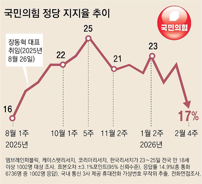 엠브레인퍼블릭, 케이스탯리서치, 코리아리서치, 한국리서치가 23∼25일 전국 만 18세 이상 남녀 1002명을 조사해 26일 발표한 2월 넷째 주 전국지표조사(NBS·전화면접 방식·95% 신뢰수준에 표본오차 ±3.1%포인트)에서 국민의힘 정당 지지율은 17%로 조사됐다.