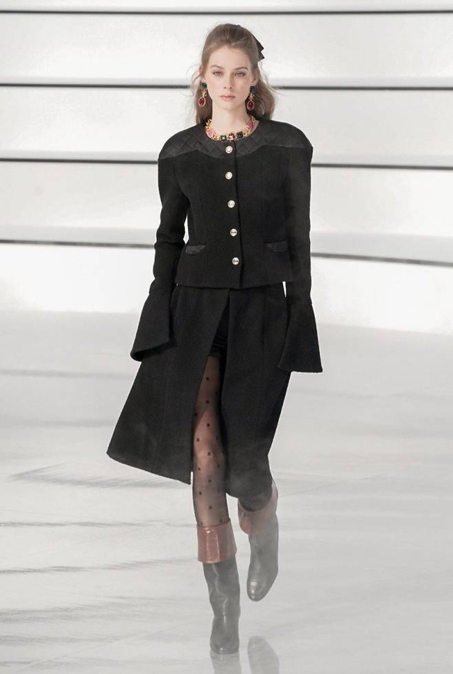 블랙 트위드 롱코트와 짧은 하의를 매치해 90년대 샤넬 감성을 현대적으로