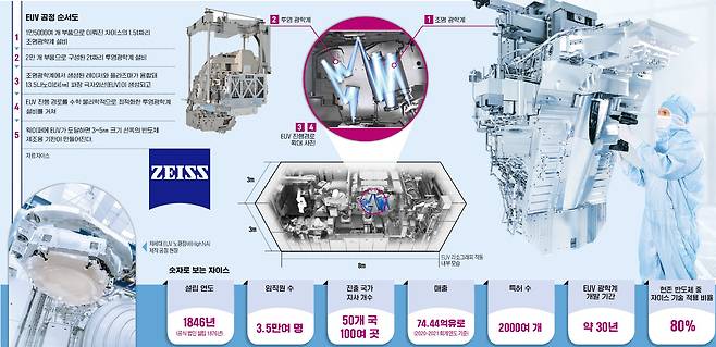 하지만 자이스의 광학시스템 없이는 EUV를 만들 수 없다. ASML은 지난해 3~5㎚ 반도체 제조용 13.5㎚ 파장 EUV 장비 42대를 팔았다. 하루 약 4000개 웨이퍼를 생산할 수 있는 이 장비의 한 대값은 출고가만 1600억원이 넘지만 기술 난이도만큼 생산량이 제한적이다. 자이스는 지난해 회계 기준(2020년 4분기~2021년 3분기) 매출이 74억4400만유로를 기록했다. 전년 대비 증가율은 20%에 달했다. 반도체 전문가는 “ASML은 EUV 생산을 위한 시스템 통합 등 관련 산업 생태계의 최상위 기업이지만 자이스의 광학 기술 없이는 무용지물”이라고 말했다.