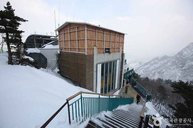 케이블카 상부 승강장에서 조금만 걸어 올라가면 권금성 전망대에 닿습니다. 겨울철에는 바람이 제법 강하게 불지만, 그만큼 설악의 산세와 동해가 시원하게 펼쳐지는 시원한 시야를 선물합니다.