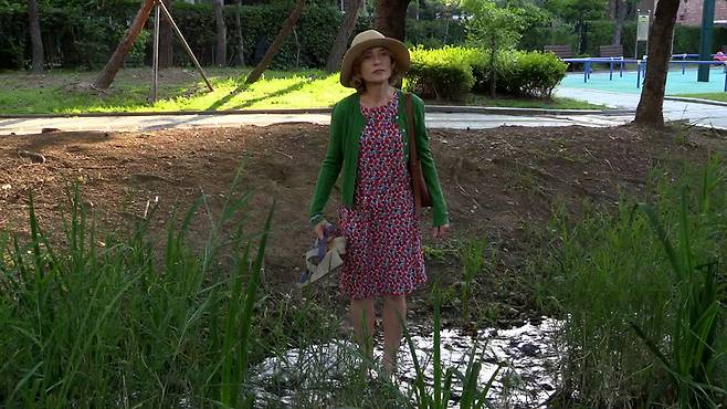 이리스는 누구일까? 정체성을 탐구하면 할수록 미궁에 빠져든다. 정확하게는 프랑스에서 왔다고 주장하지만 그마저도 알 수 없다. 현자, 정령, 신선, 도인 혹은 한국을 알고 싶어 온 여행자일까? 영화는 쉽게 답을 주지 않는다. 그녀는 기묘하다. 빨간 원피스에 녹색 카디건을 걸친 보색대비 패션. 웨지를 신고 사뿐사뿐 동네를 거닌다. 어릴 때부터 써왔다던 모자까지 장착하면 초여름의 더위를 식히는데 이만한 게 없어 보인다.