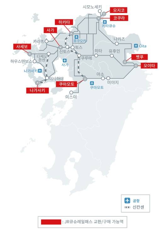 보통열차특급열차큐슈 신칸센(하카타~쿠마모토)니시큐슈 신칸센(타케오온센~나가사키)*신칸센(코쿠라~하카타 간) 및 지하철, 기타 버스와 전철에는 탑승하실 수 없습니다.