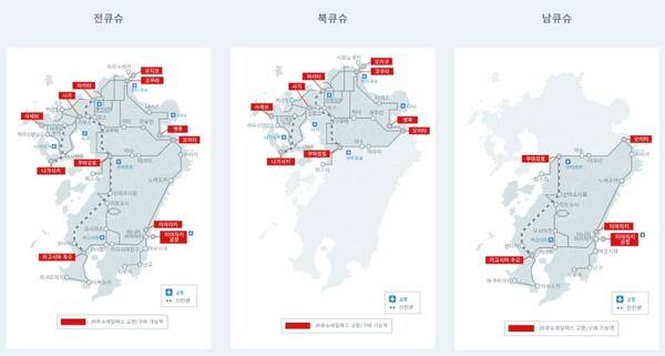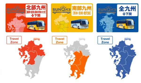 후쿠오카, 사가, 나가사키, 오이타, 구마모토 총 5개 지역+ 시모노세키 고속버스,시내 노선버스와 크루즈(5개 항로)남부 규슈