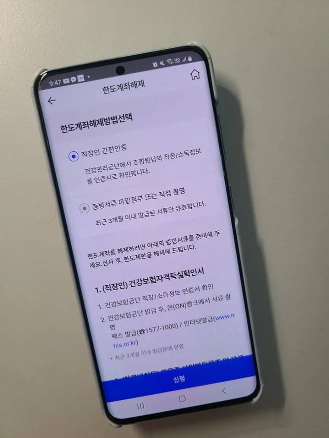 한도계좌 해제에는 용도확인 증빙이 필요하며, 직장인일 경우 공인인증서를 통한 스크래핑으로 간편하게 증빙이 제출됩니다.