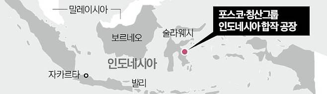 포스코는 세계 1위 스테인리스강 기업인 중국 칭산그룹과 짓는 공장 부지를 인도네시아 중부 술라웨시섬 모로왈리 산업단지로 낙점했다. 이르면 내년 착공에 들어가 2030년 이전에 연 200만t 규모로 짓는 게 목표다.