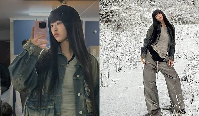 또한, 데님 재킷과 회색 톱을 레이어드한 스타일은 차가운 설원과 자연스럽게 어우러지며, 캐주얼한 무드를 더했습니다. 허리에 멘 슬링백은 실용적이면서도 스타일리시한 포인트로 작용하며, 겨울 야외 활동에 적합한 아이템으로 보입니다.