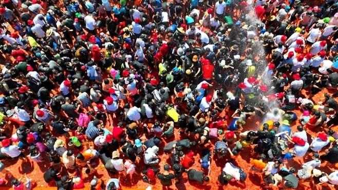 붉은 토마토 속에 황금반지가 숨겨져 있다면 믿을 수 있을까. 더위에 지친 사람들이 산속 마을에 모여 토마토를 던지고, 밟고, 온몸에 묻히며 즐기는 이색 축제가 한여름을 뜨겁게 달군다.