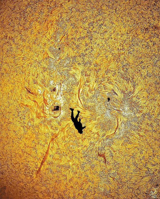 태양을 향해 떨어지는 듯한 사람 그림자 같은 윤곽도, 이글거리는 태양 표면의 질감도 모두 매카시의 렌즈가 포착한 현실이다. 발단은 스카이다이버의 농담 같은 제안이었다. 스페이스X 로켓이 태양 앞을 가로지르는 듯한 매카시의 사진을 본 스카이다이버가 “다음 작품에선 로켓 자리에 내가 있으면 좋겠다”고 했다. 말도 안 되는 엉뚱한 발상 같았지만, 친구 사이인 두 사람은 실제로 해보기로 했다.