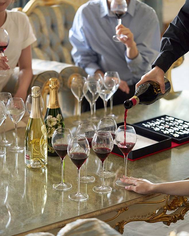 프레지덴셜 스위트룸 투어가 마무리되면 곧이어 헤드 소믈리에가 진행하는 와인 테이스팅 클래스가 이어진다. 여름 시즌에 맞춰 페리에 주에 샴페인으로 진행한다. 페리에 주에는 대한항공 퍼스트 클래스에 제공하는 샴페인으로 빅토리아 여왕, 나폴레옹 3세, 레오폴드 1세 등 유럽 왕실의 선택을 받은 것으로 유명하다. 클래스는 오직 매주 금요일에만 열리니 늦지 않게 예약하는 것이 좋다. 이번 기회에 초호화 객실에서 진짜 와인을 즐겨보자.