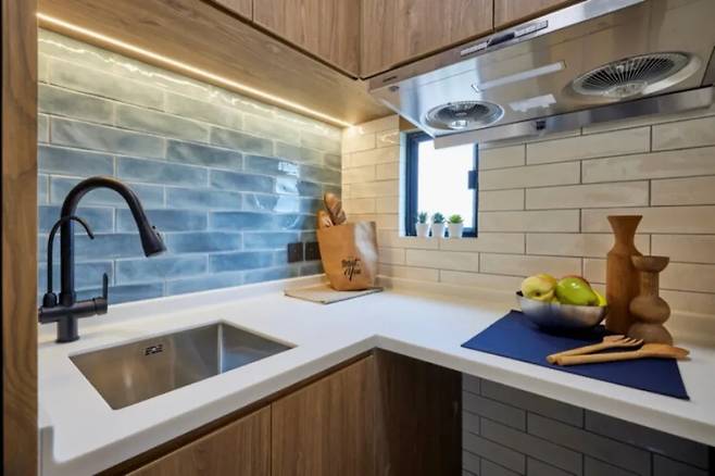 작지만 기능이 뛰어난 주방과 욕실은 원목 톤온톤 인테리어 속에서 유일하게 다양한 색감을 더한 곳이다.