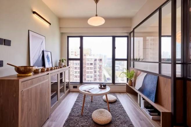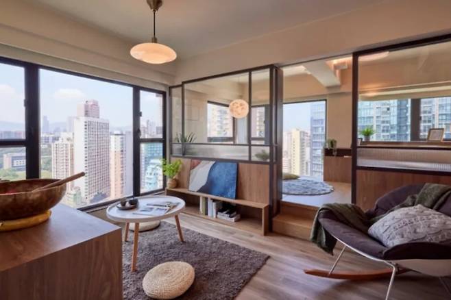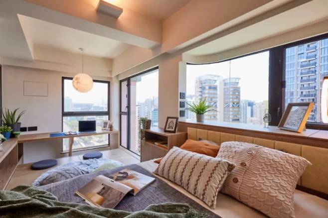 거실은 복합적인 용도로 설계되어 휴식과 업무를 동시에 지원한다. 중앙에는 전통적인 책상 대신 벽에 부착된 일렬의 슬림한 데스크가 설치되어 가벼운 느낌을 준다.