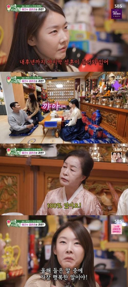 이어 한혜진은 “어린 시절이었으니까 항상 안쓰러워 보이는 마음에 챙겨줬다”라고 답했다. 무당은 “내후년까지 마지막 성혼이 들어차 있다. 결혼할 연하인 사람이 있다.”는 얘기에 혜진은 기쁜 표정을 지을 수 있었다.