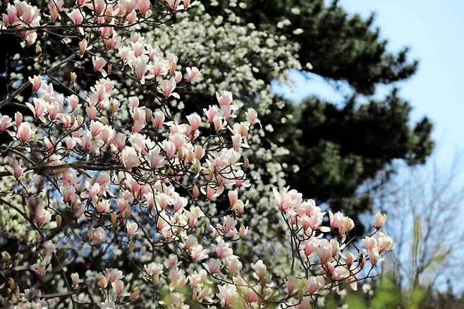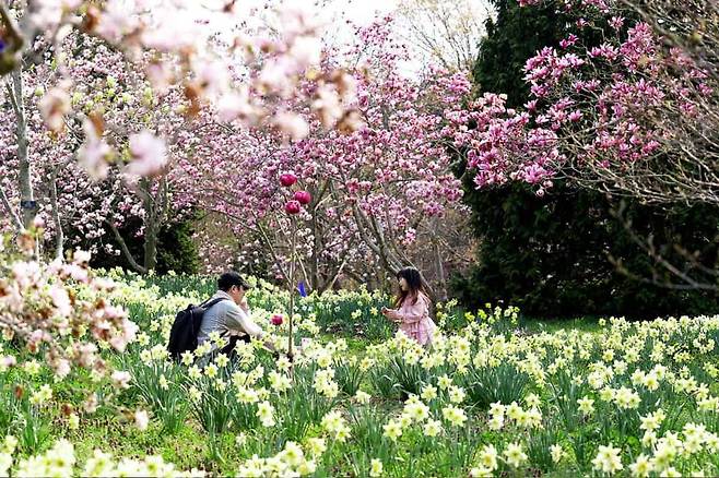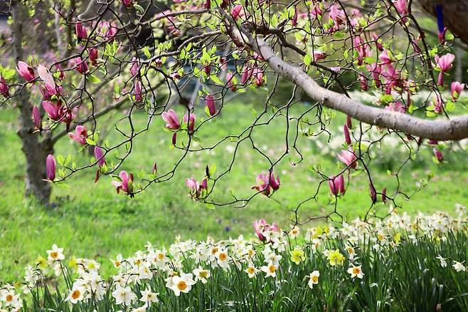 목련정원은 이름만큼이나 환상적이다. 불칸, 빅 버사, 로부스타 같은 화려한 목련 품종이 노란 수선화와 어우러지며 '천상의 정원'이라는 표현이 부족하지 않다.