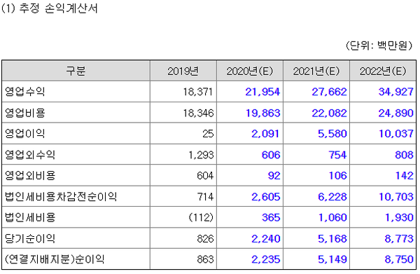 솔트룩스는 가파른 성장세에 힘입어 2020년 코스닥시장에 입성했다. 당시 기술특례 트랙으로 기업공개(IPO)를 진행했다. 회사는 증권신고서에서 2022년 영업이익 100억원, 순이익 88억원을 기록할 것으로 전망했다.
