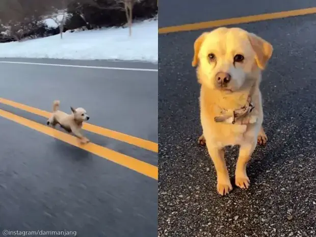 영상에는 바이크를 타고 있는 촬영자를 보며 뛰어오는 어린 강아지의 모습이 보인다.
