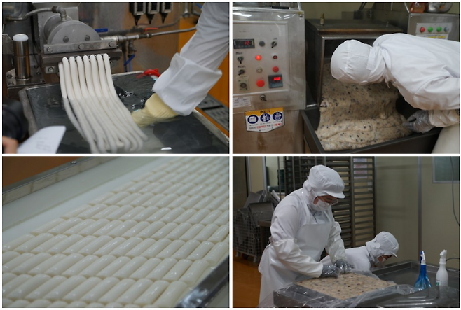 “냉동떡부터 설명 드릴게요. 냉동떡은 찹쌀로 만듭니다. 도정부에서 도정된 찹쌀을 세척한 후 불립니다. 이후 롤러를 통해 2번에 걸쳐 쌀을 곱게 갈아요. 곱게 간 쌀가루를 증자기에 투입해서 떡을 찝니다. 중간중간 올리고당, 땅콩, 콩 같은 재료를 투입해서 함께 찝니다. 중자기에 재료를 섞는 날이 있거든요. 떡을 40분간 찐 후 틀에 넣어서 모양을 맞춰줍니다. 이후 떡의 수분이 날아가지 않게 영하 30도에서 급속 냉동합니다.”