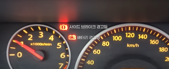 실험을 위해 제너레이터를 임의로 분리한 후 시동을 걸어보았는데, 시동을 걸자마자 제너레이터 발전기 전원이 안 들어가다 보니 사이드브레이크 경고등과 배터리 경고등이 점등 되는 모습을 볼 수 있었습니다.