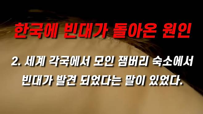 그동안 한국인들은 해외여행을 갔다가 빈대를 처음 접하는 경우가 많았는데요. 빈대에 대한 경험이 너무 없다 보니 해외여행 중 빈대에 물렸을 때 바로 알아차리지 못해 여행짐에서 빈대가 번식하는 등 피해를 크게 입는 경우가 많았다고 합니다. 이렇게 한국에서 싹 사라진 줄 알았던 빈대가 다시 출몰하기 시작한 것인데요 전문가들은 한국에 다시 빈대가 나타난 이유로 다음 세 가지 경우를 꼽고 있습니다. 첫 번째, 코로나 이후 외국인 관광객들이 많아지면서 퍼지게 된 것이다. 두 번째, 세계 각국에서 모인 잼버리 숙소에서 빈대가 발견되었다는 말이 있었다. 세 번째, 한국에 원래 있던 빈대가 퍼진 것이다.