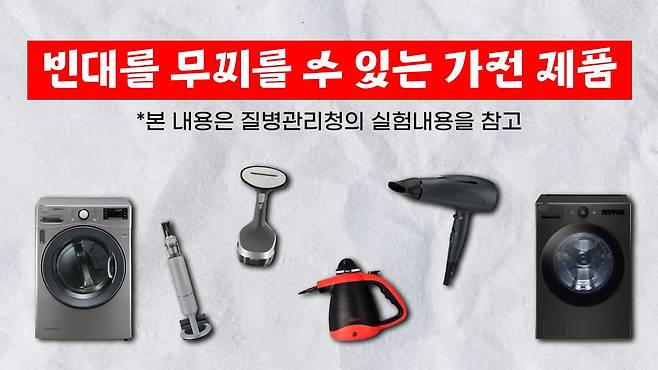 마지막으로 가정에서 빈대를 무찌를 수 있는 방법에 대해 알아보겠습니다. 본 내용은 질병관리청의 실험 내용을 참고했습니다. 집에 있는 흔한 가전제품으로 빈대를 없앨 수 있다고 하는데요. 청소기, 스팀다리미 또는 스팀기, 다리미, 드라이기, 건조기, 세탁기 중 하나만 있어도 가능합니다.