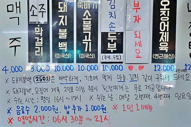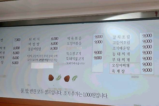 정돈되지 않은 메뉴판, 익숙한 은색 그릇, 셀프 리필 반찬통.