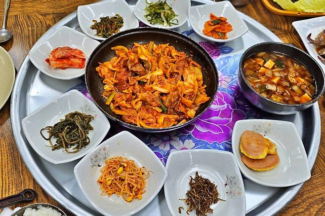강원도 원주 북원로에 위치한 미가일식당은 이름 그대로 ‘미가일 정식’이 시그니처 메뉴다. 제육볶음과 된장찌개, 생선구이, 간장게장, 다양한 밑반찬이 하나의 쟁반에 빼곡히 담겨 나오는 푸짐한 백반 구성이다. 밥상 하나로 강원도 향토음식의 조화로움을 느낄 수 있다.