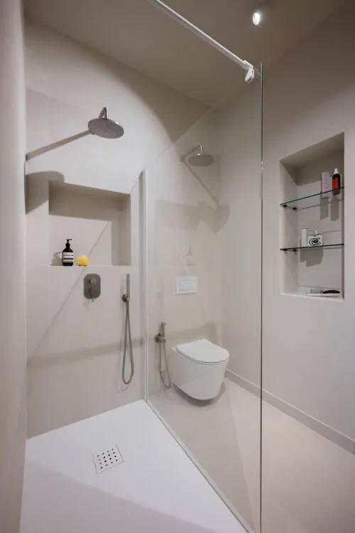 욕실은 전체 인테리어의 분위기와 맞춰 화이트와 베이지 톤으로 구성되었다. 매립형 선반과 간접조명으로 실용성과 감성을 모두 잡았으며, 밝고 정돈된 느낌이 강조된다. 작지만 깔끔한 구성으로 소형 주택의 미니멀 감성을 이어간다.