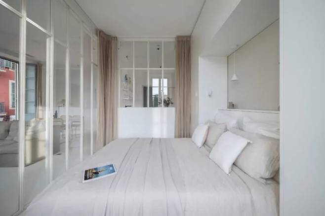 침실은 유리 가벽으로 구분되어 자연광이 주방까지 이어지도록 설계됐다. 프라이버시는 린넨 커튼으로 확보했으며, 빛을 완전히 차단하지 않고 부드럽게 걸러줘 눈부심 없는 채광 효과를 제공한다. 이로 인해 집 전체가 낮에도 조명을 최소화할 수 있다.
