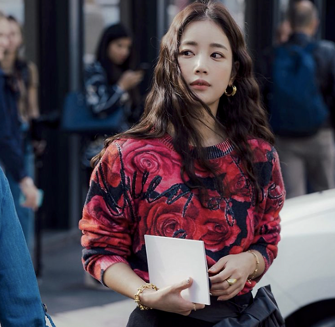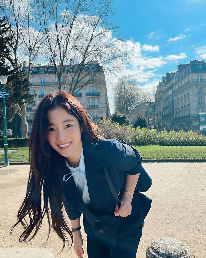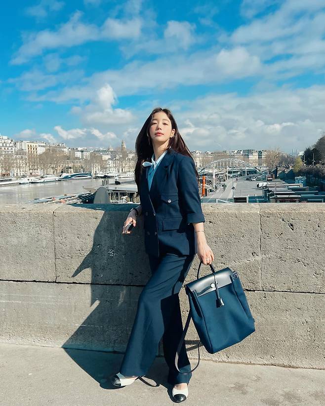 센느강을 배경으로 클래식하면서도 네이비 컬러의 세련된 수트와 토트백을 든 기은세의 모습 너머로 푸른 하늘과 멋들어진 구름까지 완벽한 조화를 이룬 모습이었습니다.