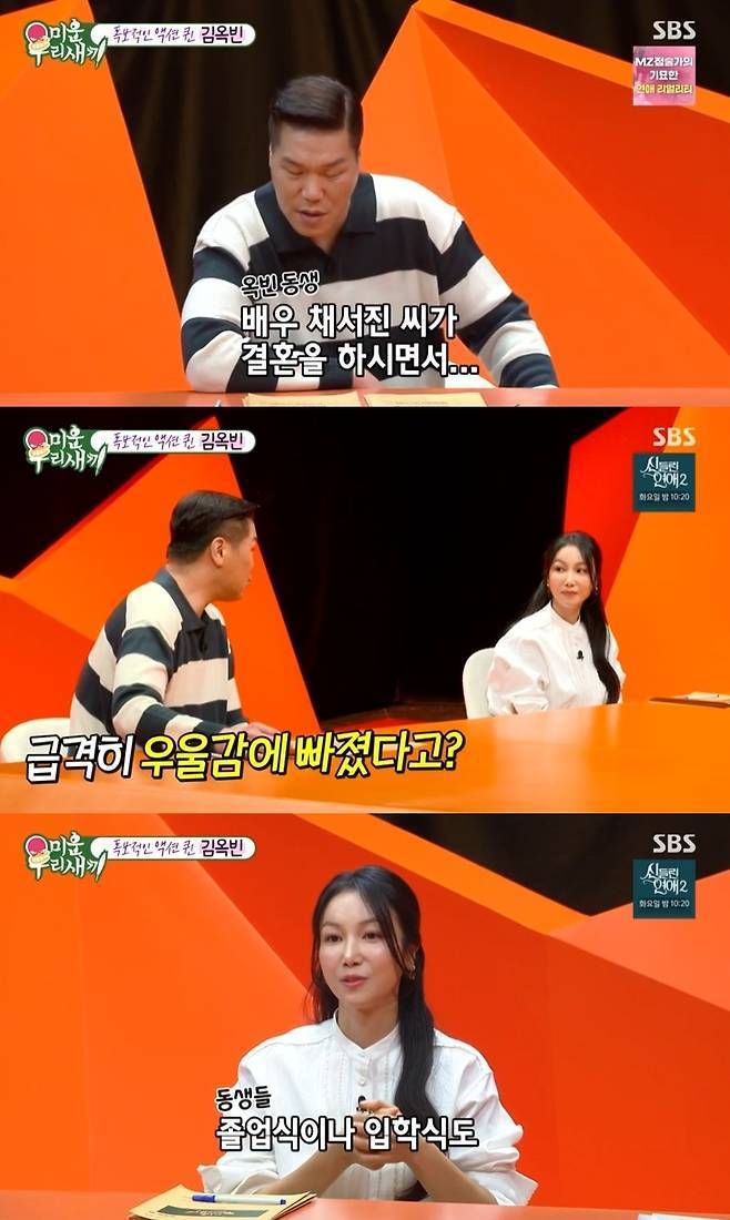 이날 김옥빈은 "22년 동안 같이 살았던 동생이 결혼하고 급격히 우울감에 빠졌다던데?"라는 말에 "동생들이 학교 다닐 때, 학비·용돈·교복비를 비롯해 입학식, 졸업식도 제가 다 갔다. 대학 등록금도 제가 냈다. 부모님이 멀리 사셔서 바쁘셨고 제가 그 역할을 해야 한다는 생각에 열심히 했다"고 말했다.