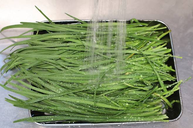 흐르는 물에 풍덩 담근 다음 시든 잎은 골라내고요. 지저분한 이물질과 흙을 씻어주세요.