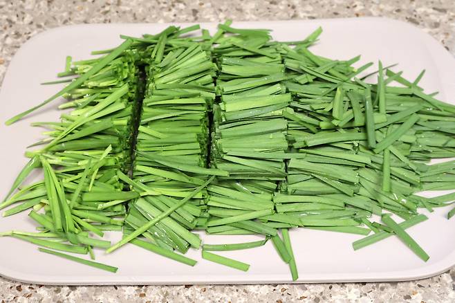 부추는 4cm 정도 길이로 썰어요. 너무 길면 먹기 힘든디 이정도 길이가 적당해요.